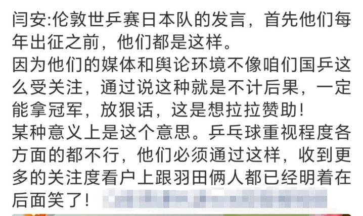 前国手闫安和他老婆在直播中就表示,日本队这种赛前放狠话的行为是惯例,因为日本国内对于乒乓球的关注度并不如中国,所以这些日本运动员就需要通过这种放狠话的方式吸引大家的关注,从而让一些企业赞助。